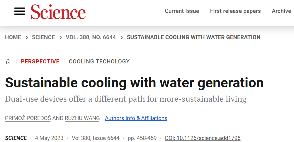 机械与动力工程学院王如竹教授团队在Science发表了题为“Sustainable cooling with water generation”的Perspective前瞻性文章。制冷与低温工程研究所博士后Primož Poredoš为论文第一作者,王如竹教授为通讯作者。