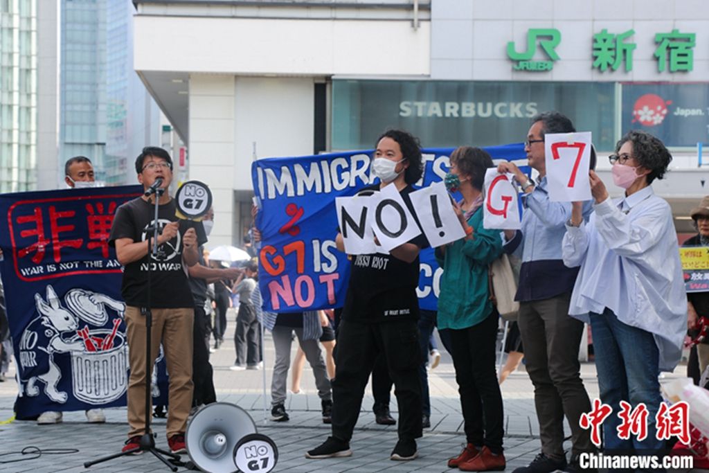 集会组织方在宣传资料上写道:G7只会助长战争、贫困和环境破坏,我们在东京发出抗议G7的声音。集会组织方介绍,为反对G7广岛峰会,他们此前已于峰会前夕组织上百人在新宿进行了游行抗议。