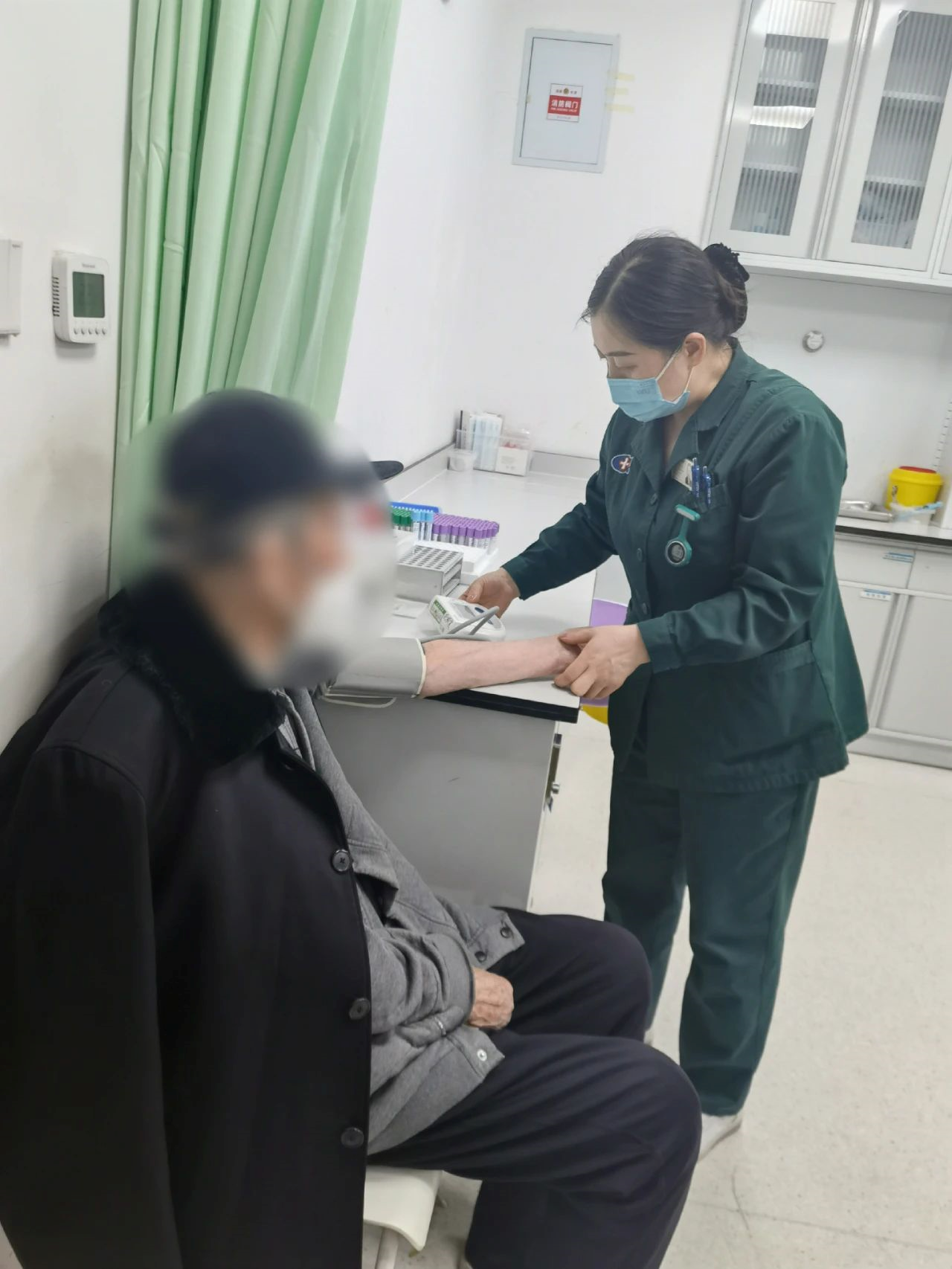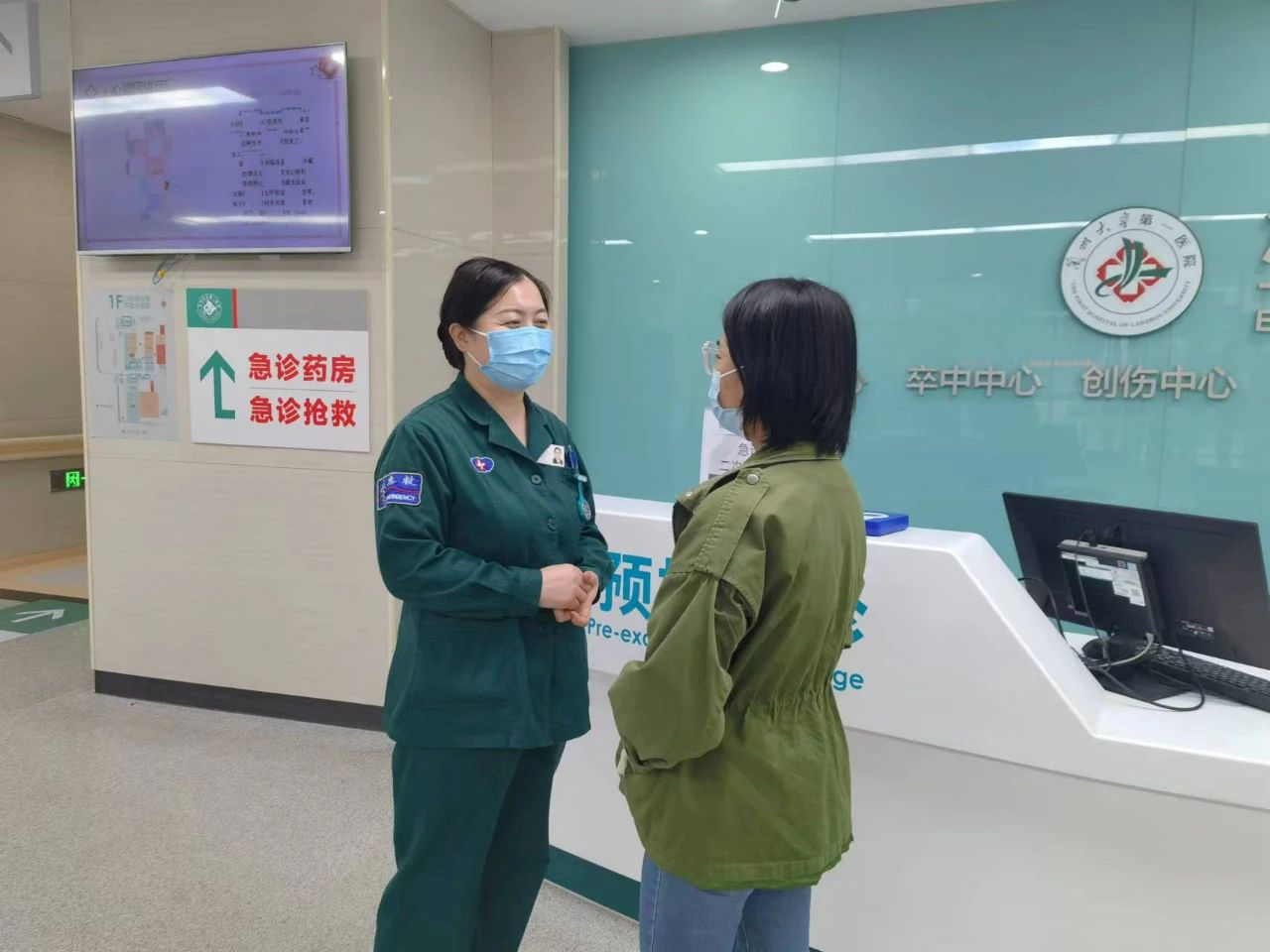 采访结束之际,王伟笑着说再见,起身后又和走廊里的病人沟通起来。她身上穿着的是急诊科护士特有的绿色护士服,袖子右侧的红十字点缀其中。