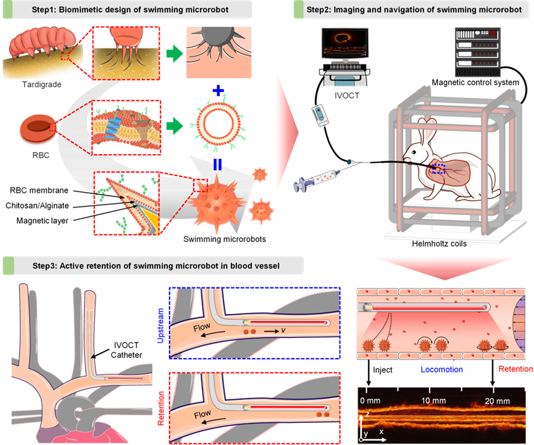 微纳机器人凭借其体积小、质量轻、推重比大等特点,在药物靶向递送领域具有很好的发展前景。然而,多年来却因面临如何实现在血液高流速环境下高效驱动、如何实现循环系统内靶向释放等挑战而无法在医学上应用。