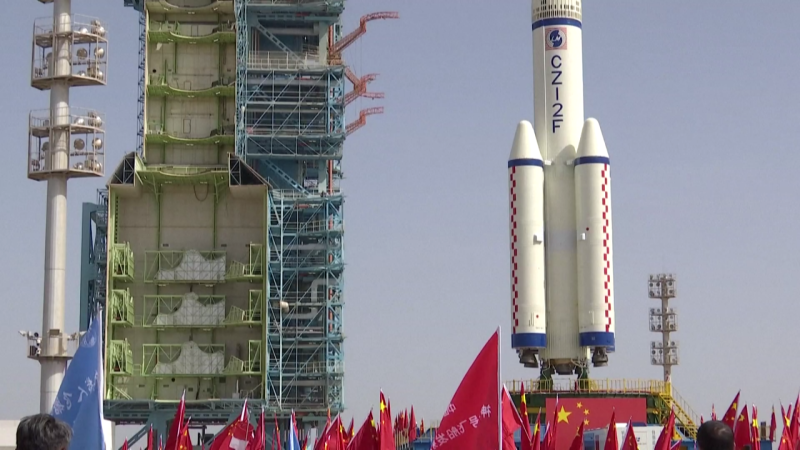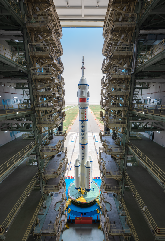 2023年5月22日,在酒泉卫星发射中心,神舟十六号载人飞船与长征二号F遥十六运载火箭组合体转运至发射区。