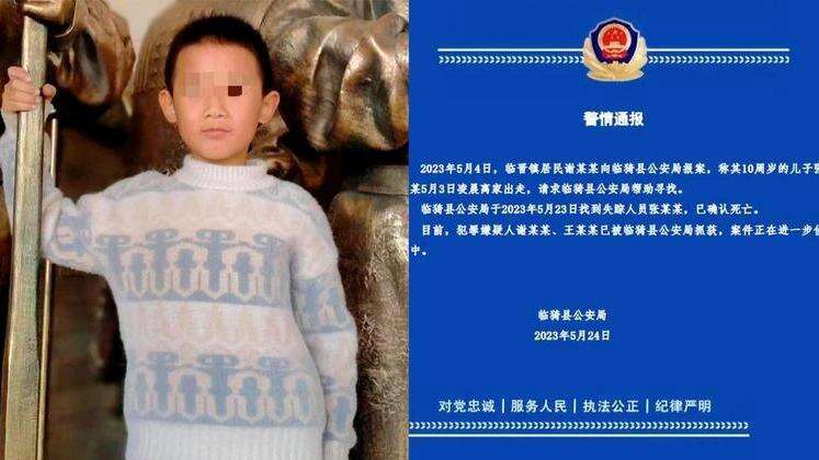 据山西临猗县公安局发布的警情通报:2023年5月4日,临晋镇居民谢某某向临猗县公安局报案,称其10周岁的儿子张某某5月3日凌晨离家出走。临猗县公安局于2023年5月23日找到失踪人员张某某,已确认死亡。目前,犯罪嫌疑人谢某某、王某某已被临猗县公安局抓获,案件正在进一步侦办中。