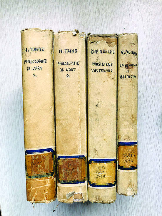 右上:勒内·福舒瓦的《贝多芬的爱情生活》(右一)一书,和傅雷藏书中的《古代音乐家》(右二)以及《艺术哲学》(两册)一样,都有白色的硬壳封面,书脊上都用同样的字体写着书的作者和书名。因此,笔者认为它“疑是”傅雷藏书。