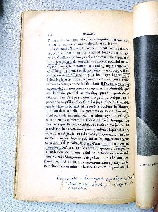 右图:1955年3月24日,傅雷将卡米耶·贝莱格的《莫扎特》一书末尾部分翻译出来,名之为《莫扎特的作品不像他的生活,而像他的灵魂》,供傅聪学习用。图为他在这一部分内容上的划痕和笔记。