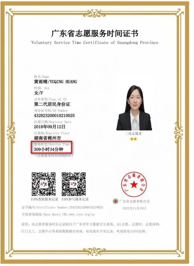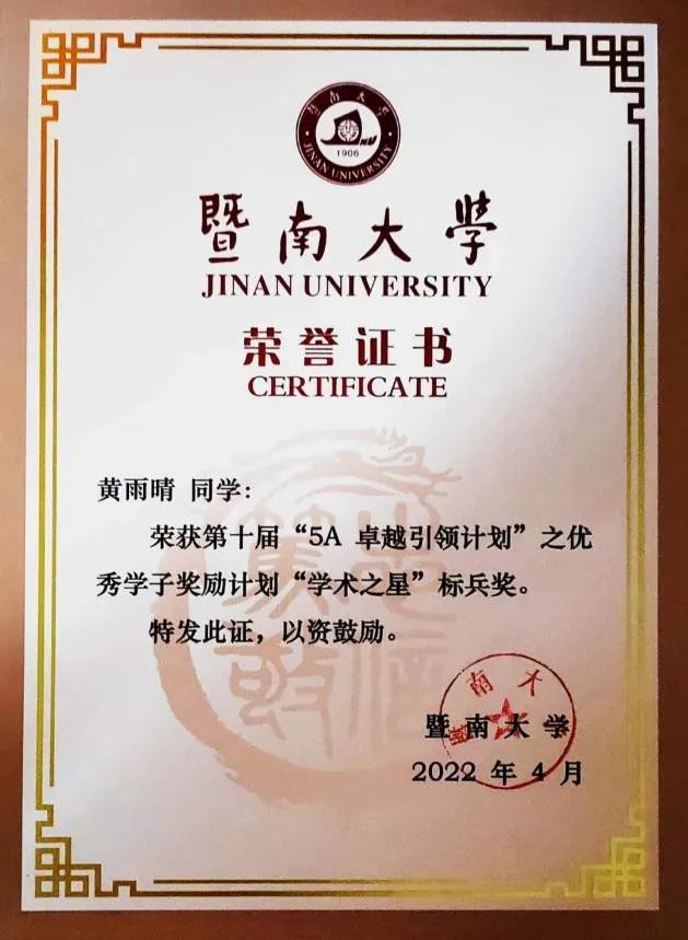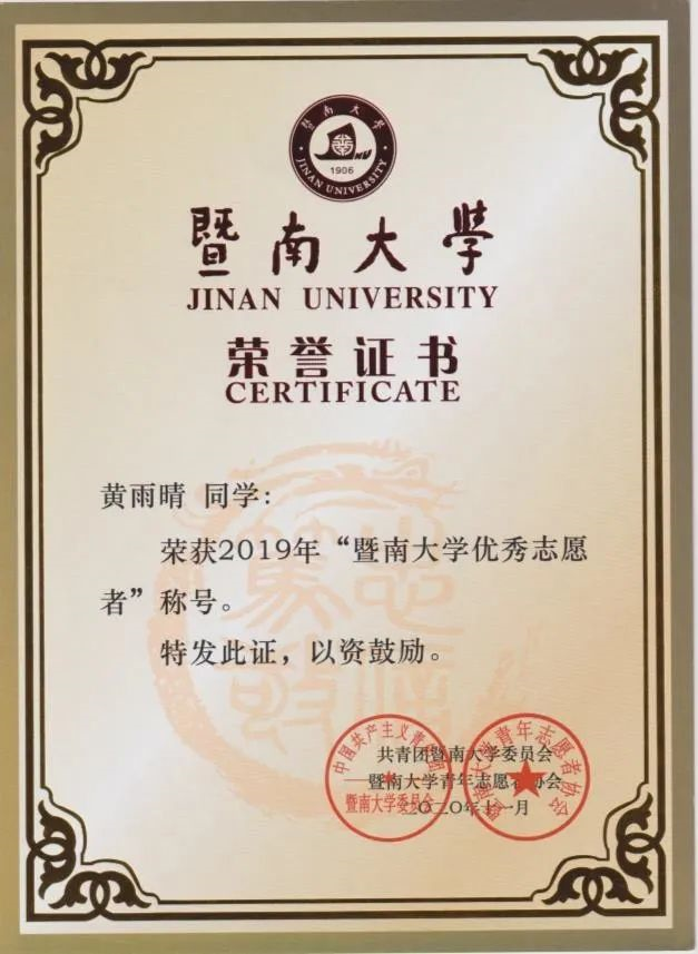 (黄雨晴获评“暨南大学优秀志愿者”)