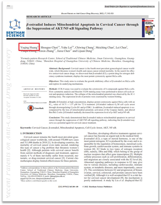 (黄雨晴以第一作者发表在医学期刊Recent Patent on Anti-Cancer Drug Discovery上的SCI论文)