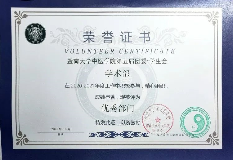 (黄雨晴所在的学术部获评“优秀部门”