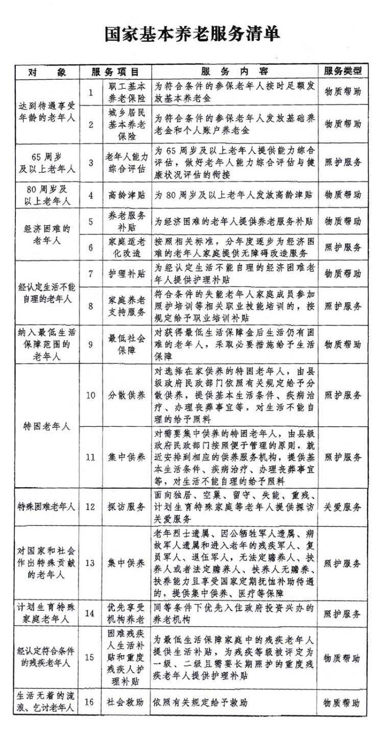 据了解,《国家基本养老服务清单》以保障老年人的基本生活安全为主线,对现行有效的法律法规和政策文件中已经明确的涉及老年人的基本服务项目进行了梳理归纳,整合到基本养老服务的制度框架下。