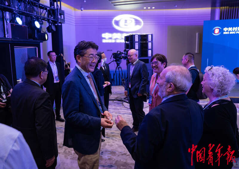 5月26日,2023中关村论坛全球大流行病的应对和国际合作平行论坛开始前,中国科学院院士高福与中国科学院深圳先进技术研究院生物医药与技术研究所炎症与疫苗实验室首席科学家Aldo Tagliabue、中国科学院深圳先进技术研究院生物医药与技术研究所炎症与疫苗实验室主任Diana Boraschi等专家学者交谈。中青报·中青网记者 李峥苨/摄