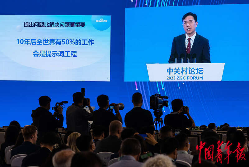 5月26日,2023中关村论坛全体大会上,百度创始人、董事长兼首席执行官李彦宏在题为《加快场景创新,让人工智能成为实体经济发展的头雁》的演讲中表示,自然语言人机交互会带来提示词革命。他预测,10年后,全世界有50%的工作会是“提示词工程”。中青报·中青网记者 李峥苨/摄