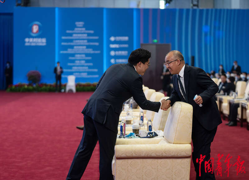 5月26日,2023中关村论坛全体大会上,全国青联副主席、亚洲电子体育联合会主席霍启刚发表演讲后走下舞台,与大会主持人、北京市副市长于英杰握手。中青报·中青网记者 李峥苨/摄
