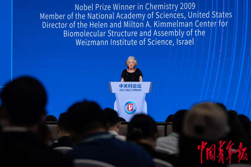 5月26日,2023中关村论坛全体大会上,2009年诺贝尔化学奖得主,美国国家科学院院士,以色列魏茨曼科学研究所齐莫曼生物分子结构与组装中心主任阿达·约纳特发表视频演讲。中青报·中青网记者 李峥苨/摄