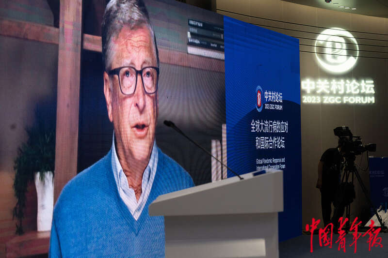 5月26日,2023中关村论坛上,比尔及梅琳达·盖茨基金会联席主席兼理事比尔·盖茨作主题为《创新与合作-人类共享未来的希望》的视频演讲。中青报·中青网记者 李峥苨/摄
