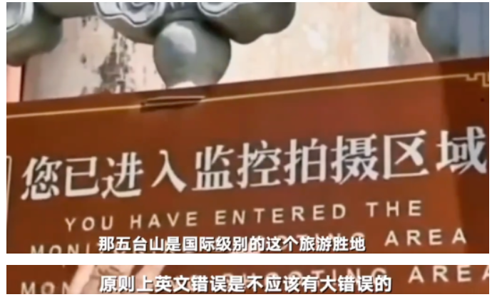 5月24日,俞敏洪老师携东方甄选团队在五台山景区直播期间,指出了景区塔院寺门口“您已进入监控拍摄区域”提示牌英文译文的错误。