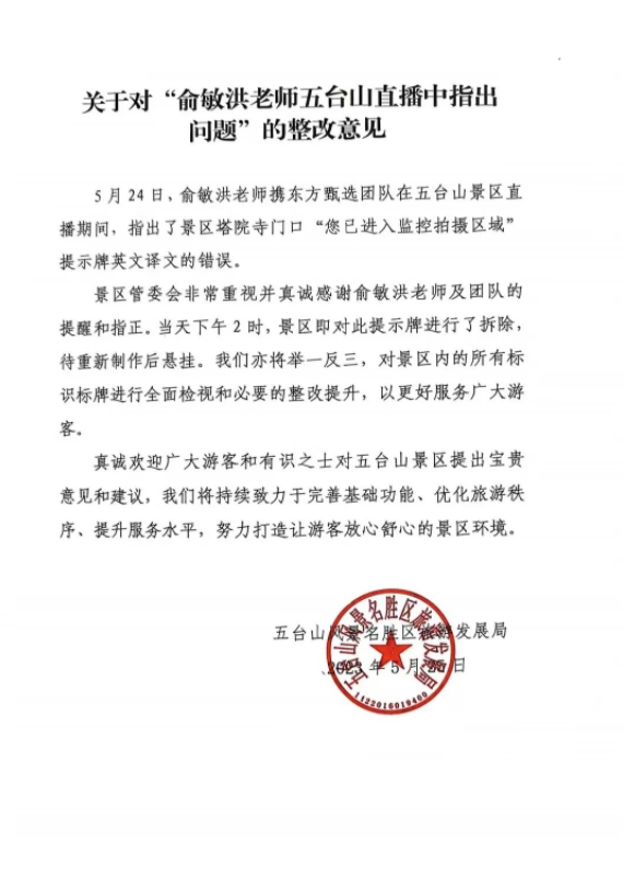 5月25日,五台山风景名胜区旅游发展局发布关于对“俞敏洪老师五台山直播中指出问题”的整改意见: