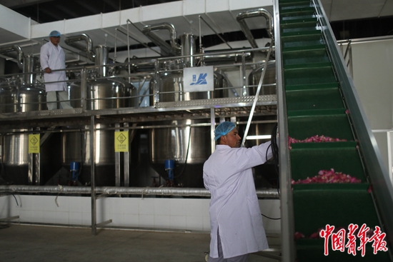 随着玫瑰背后的经济效益被更多人看到,于田县本地的玫瑰种植加工企业也在探索由传统走向精深加工的产业转型升级之路。