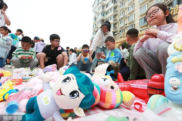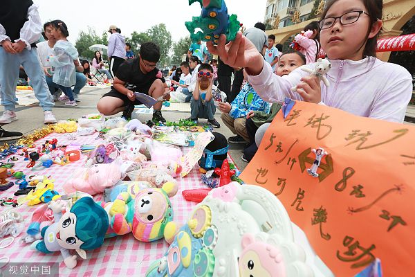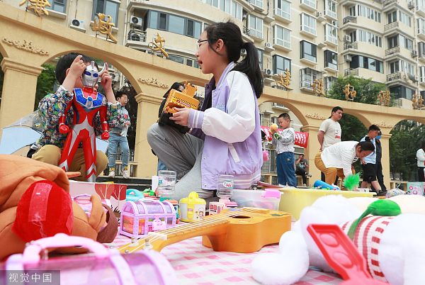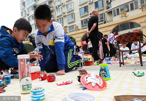 2023年5月27日,北京怀柔区,丽湖馨居社区闲置小物品交换现场,小朋友在交换物品。