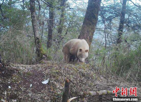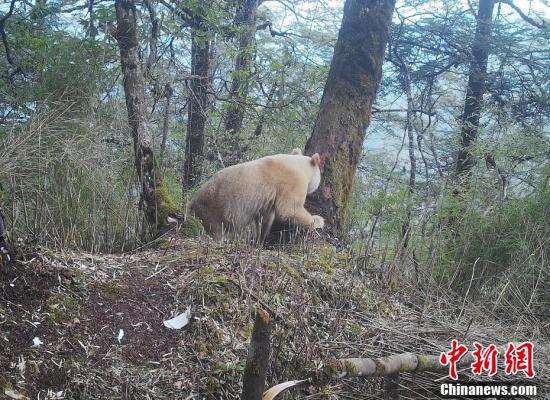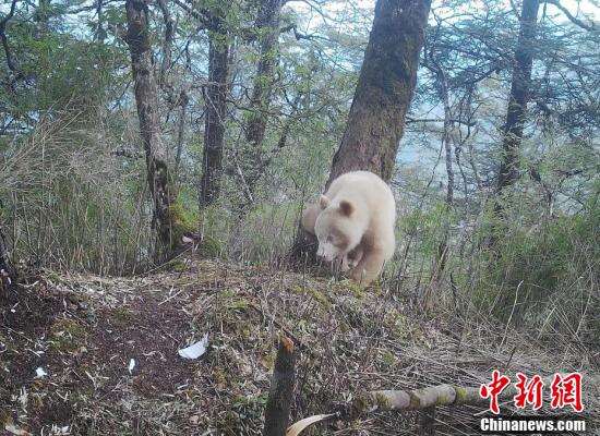 2019年4月,四川卧龙国家级自然保护区内,海拔2000米左右的一台野外红外触发相机首次摄录下这只白色大熊猫的侧影。