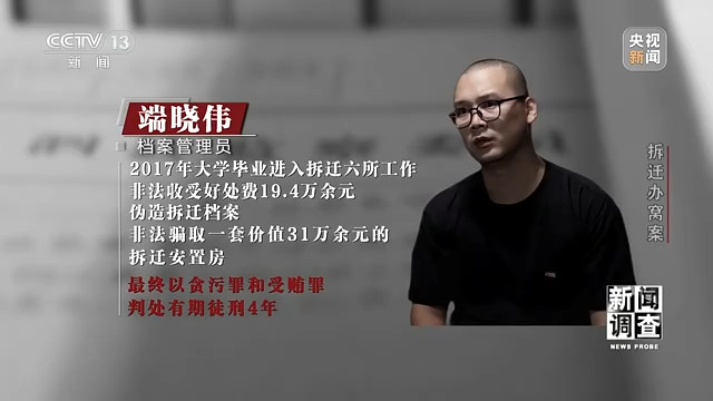 档案管理员端晓伟是2017年大学毕业进入拆迁六所工作,短短几年也非法收受好处费19.4万余元,还利用职务便利伪造拆迁档案,为自己非法骗取一套价值31万余元的拆迁安置房,最终以贪污罪和受贿罪判处有期徒刑4年。