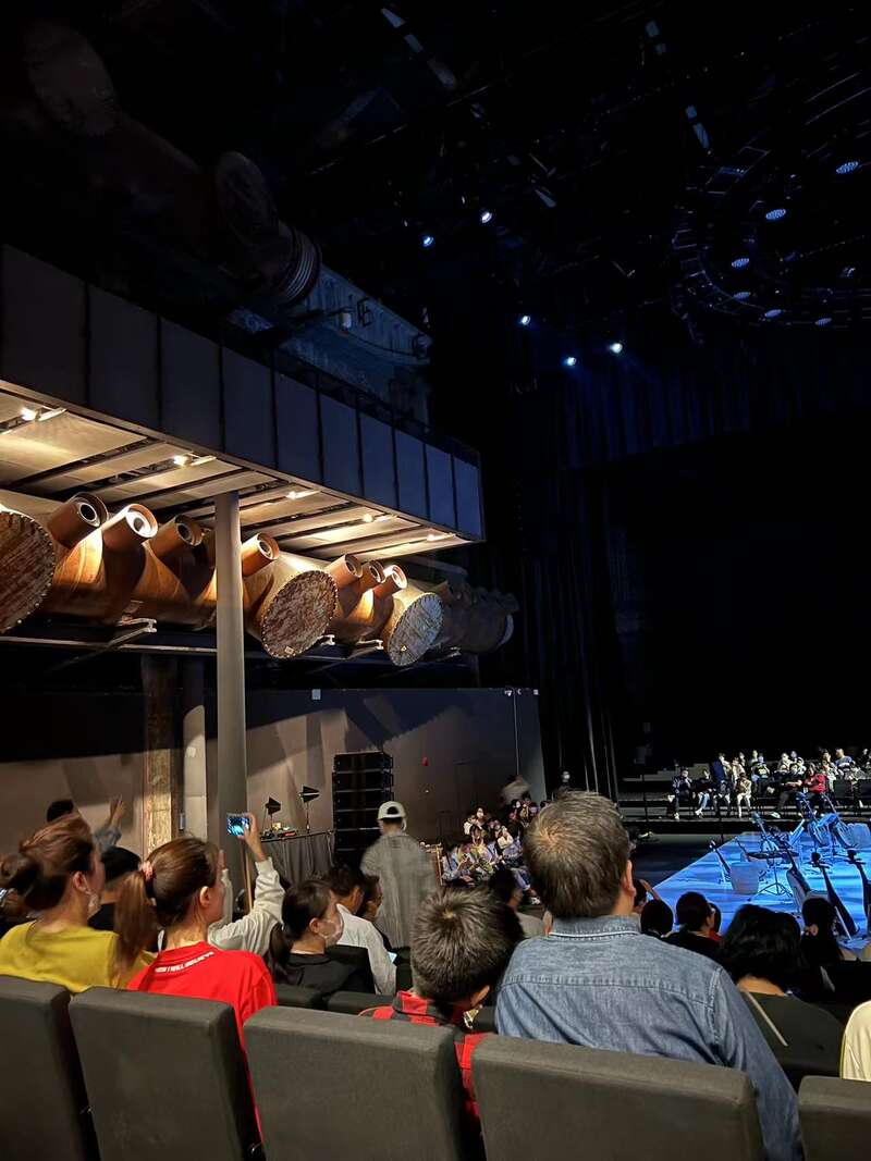 此次演出的选址也颇具匠心。1862时尚艺术中心的前身为黄浦江畔拥有百年历史的上海船厂。它地处高楼林立的上海浦东陆家嘴地区,但又是一个“老物件”——2005年上海船厂整体搬离浦东,老船厂旧址修旧如旧,高端商业体的楼道中间,仍保留着老船厂当年的铁质楼梯、蒸汽管道等。在这里,上海民族乐团打破传统镜框形制,在剧场中央搭建全新舞台,将具有东方文化意象的“中国建鼓”置于副舞台,利用通道联接呈现自下而上的视觉延伸感。