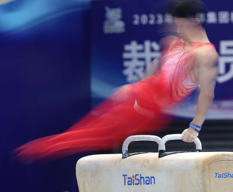 5月27日,山东省济南市奥体中心东荷体育馆,获得2023年“山体集团杯”全国体操锦标赛男子鞍马季军的尹德行在比赛中。刘占崑/摄