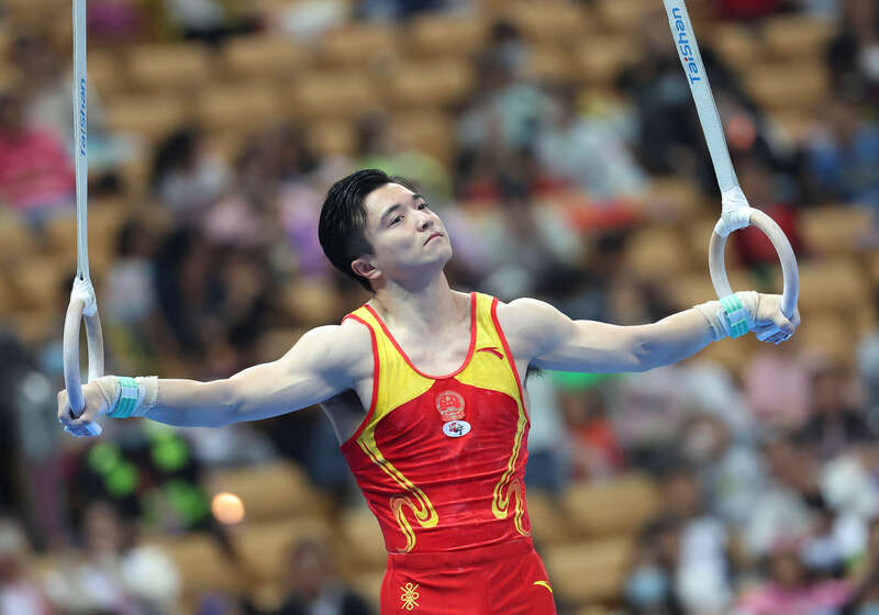 5月27日,山东省济南市奥体中心东荷体育馆,2023年“山体集团杯”全国体操锦标赛吊环金牌获得者刘洋在比赛中上演他的招牌帅气动作“歪头杀”。刘占崑/摄