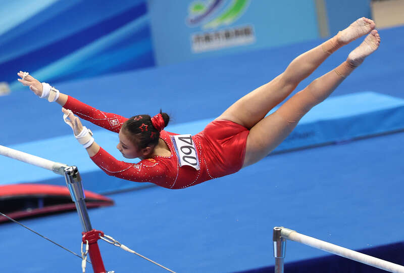 5月27日,山东省济南市奥体中心东荷体育馆,福建队的邱祺缘获得2023年“山体集团杯”全国体操锦标赛女子高低杠金牌。刘占崑/摄