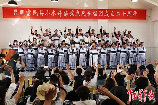 因为疫情,直到今年5月19日,小水井苗族农民合唱团才在村里新建的舞台上,举行了成立20周年专场演唱会。