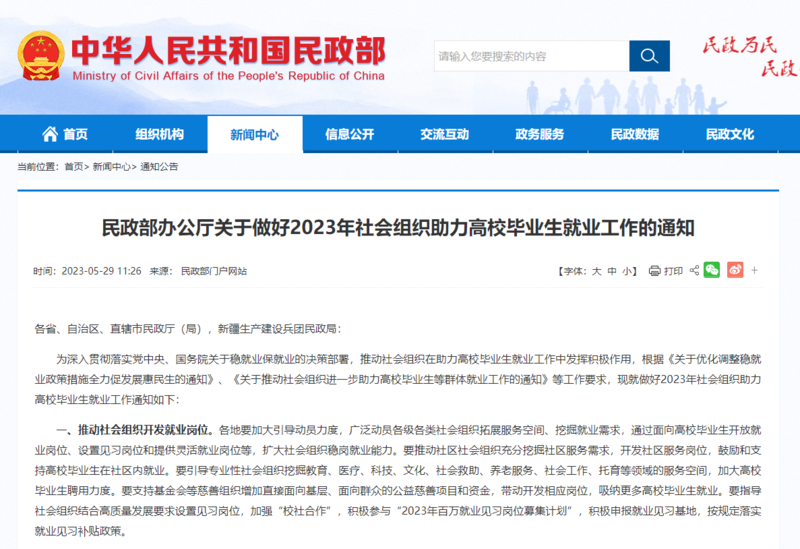 民政部办公厅关于做好2023年社会组织助力高校毕业生就业工作的通知