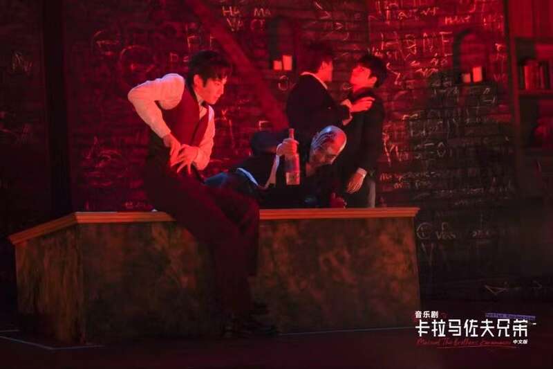 事实上,中文版音乐剧《卡拉马佐夫兄弟》的演出阵容统筹中,必然包含了对演员适配角色的精准把握,因为仅有音乐剧的表演功底,对人物本身的生成无所介入,恐怕演不好这些表象浮华,内在极端复杂的角色。此剧的演员显然完成了这一关键动作,将肢体与演唱的精气神灌注于角色自身的独有“本色”中去,令几大主人公鲜活地在台上站立起来。若纯从音乐剧文本语汇的角度来看,《卡拉马佐夫兄弟》的唱词文本其实并未达到中文的最高标准,然而词汇与音乐语汇的配合,仍然能够激发角色性格的内在张力,是在音乐剧(尤其是华语音乐剧)观赏特性与这样一部具有全球性代表意义的小说名作有机结合的成功尝试。