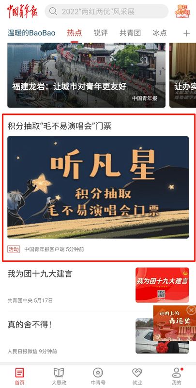 下载中国青年报客户端,搜索“积分抽取毛不易演唱会门票”,进入活动页面。