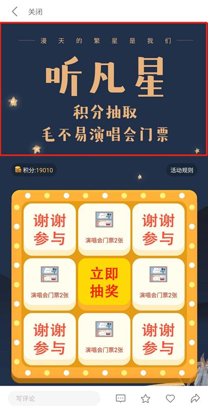 跳转链接,收听毛不易歌曲《凡星》,即可获得抽奖积分。