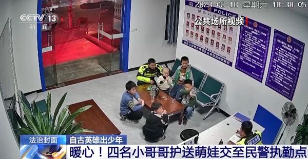 一会儿抱着,一会儿牵着,走走停停将近半个小时,五个小家伙终于走到了最近的民警执勤点,四个小男孩把小弟弟交给警察叔叔,并清晰地向民警描述了事情经过,在等待民警联系走失男童家属的时候,四名小男孩依然暖心地陪伴着小弟弟,并喂他吃零食安抚他的情绪,陪伴了半个小时左右,民警联系上了走失男童的家长,四名小男孩才放心离开了现场。