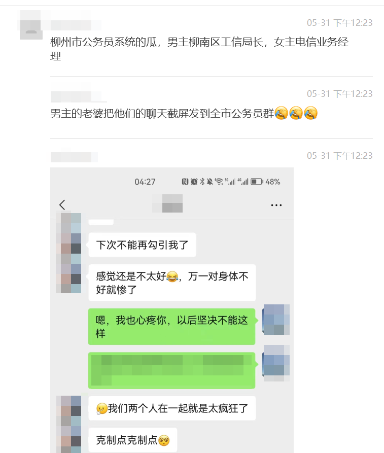 5月31日下午,澎湃新闻记者注意到,在多个网络社交平台上流传一系列微信截图,声称“柳南区工业和信息化局局长与一女性电信业务经理出轨,局长老婆发现后把两人聊天截屏发到全市公务员群”,相关截图还附上了男女双方的头像。