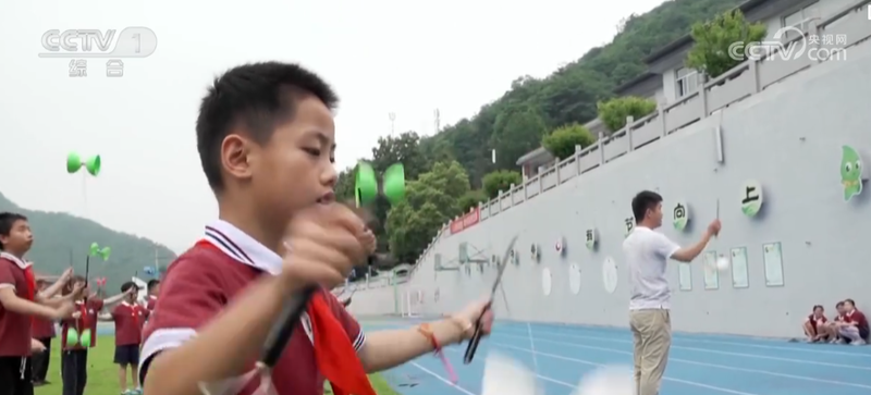 在浙江杭州富阳春建乡中心小学,学校开设了抖空竹的课程。每到大课间,全校500名学生在操场上练习抖空竹,随着各式的空竹在空中飞舞,学生们的双眼也不停地上下调节。