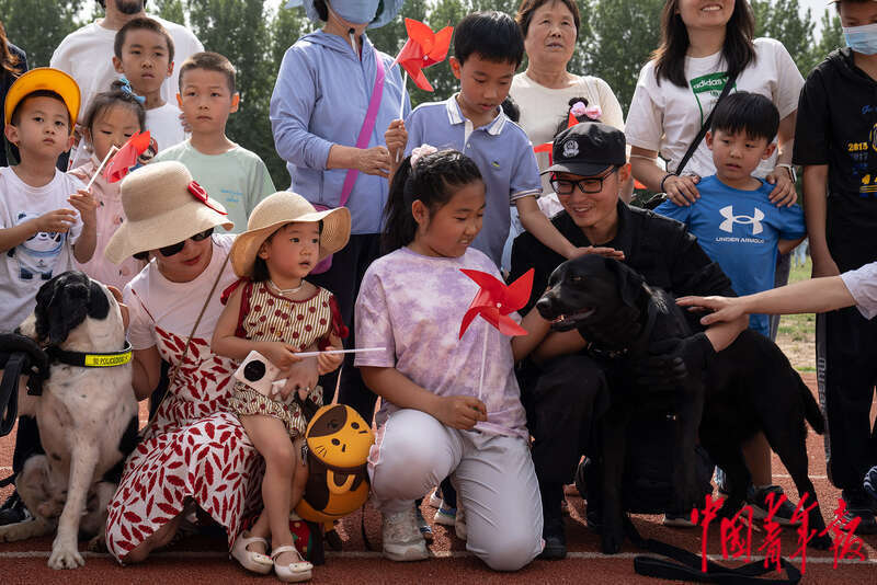 6月1日下午,北京市公安局警犬基地,小朋友近距离与警犬接触。当日,北京市公安局警犬基地举行以“萌娃进警营 携手庆六一”为主题的开放日活动,前来参观的小朋友们观看警犬搜索、服从、翻越障碍、扑咬等科目表演,近距离了解和体验刑侦和警犬训练工作,度过一个与警犬相伴的“六一”儿童节。中青报·中青网记者 李峥苨/摄