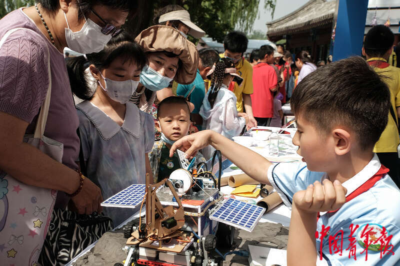 6月1日,北京北海公园,来自北京市朝阳区芳草地国际学校世纪小学四年级的少先队员王逸帆(右一)正在展示作品“月饼号”月球车。当日上午,“让我们荡起双桨”首都少先队“六一”主题队日活动在北海公园举办,300余名少先队员来到北海公园参加丰富多彩的主题队日活动。中青报·中青网记者 张玉佳/摄