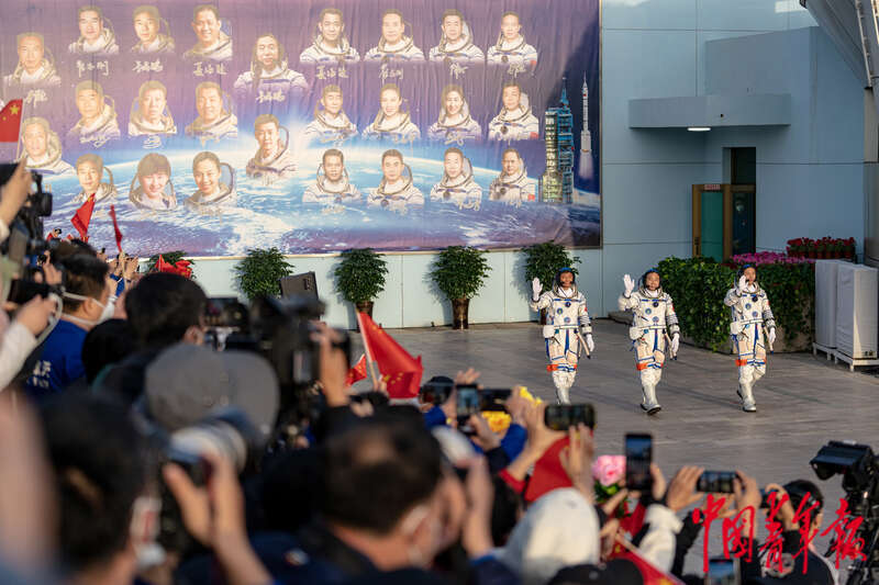 5月30日清晨,甘肃酒泉,神舟十六号载人飞行任务航天员乘组出征仪式在酒泉卫星发射中心问天阁圆梦园广场举行,3名航天员景海鹏(中)、朱杨柱(右)、桂海潮准备参加出征仪式。当日上午9时31分,搭载神舟十六号载人飞船的长征二号F遥十六运载火箭点火发射。中青报·中青网记者 李隽辉/摄