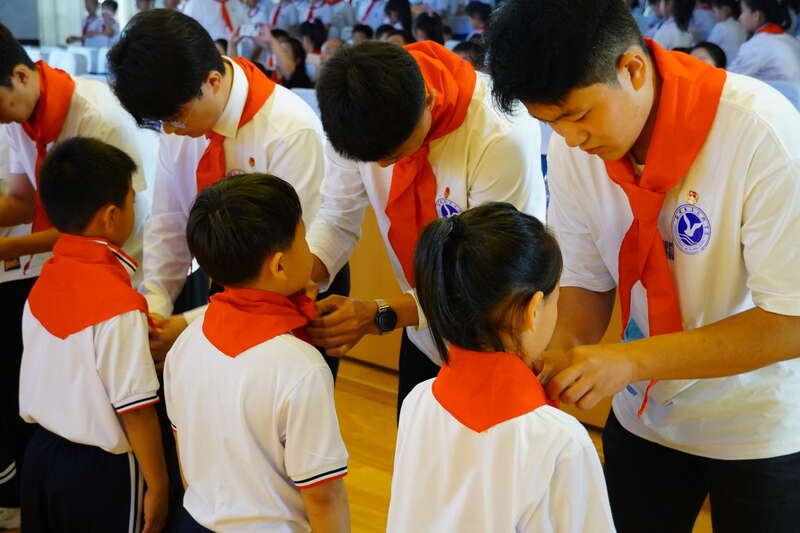 为新队员佩戴红领巾。 团聊城市委供图