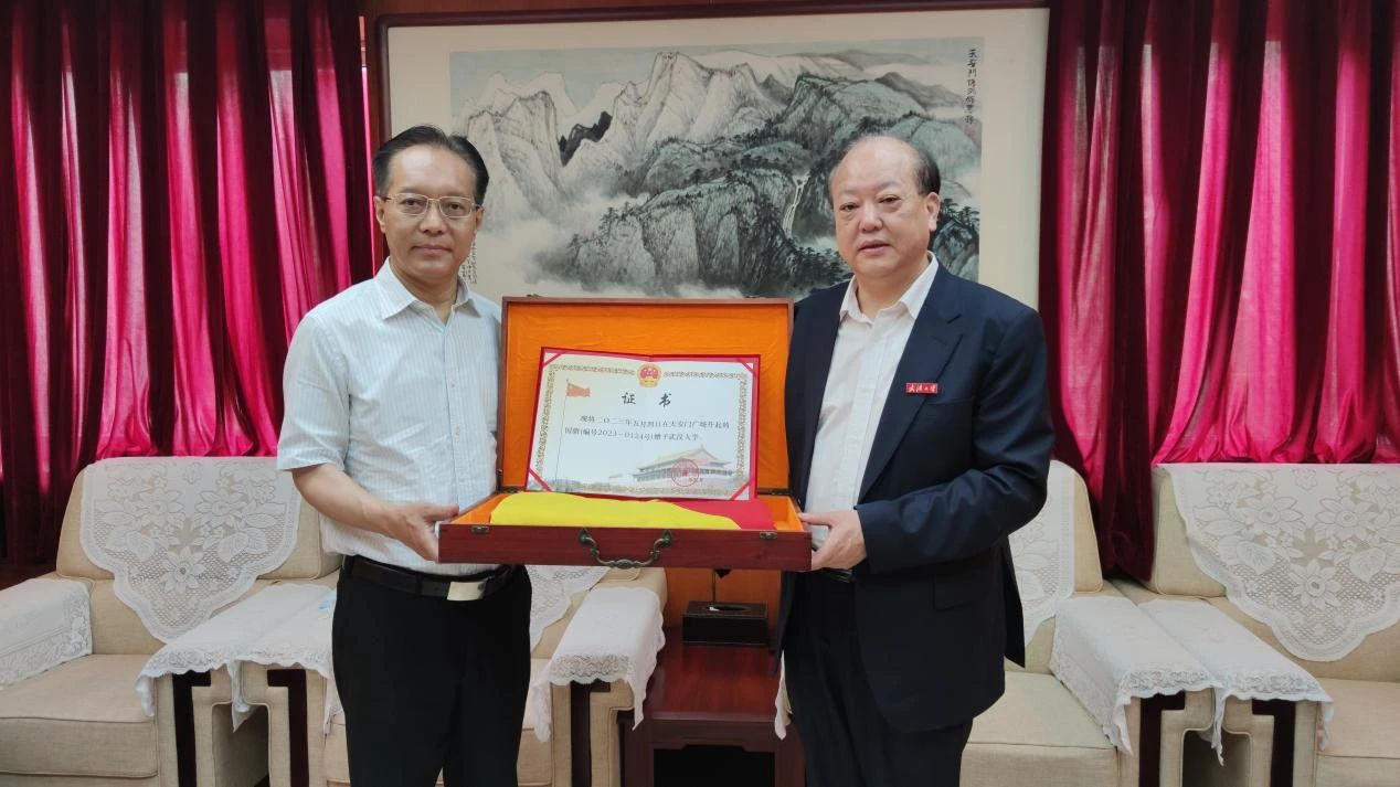 ▲管委会党组书记、主任费宝岐向武汉大学赠送国旗