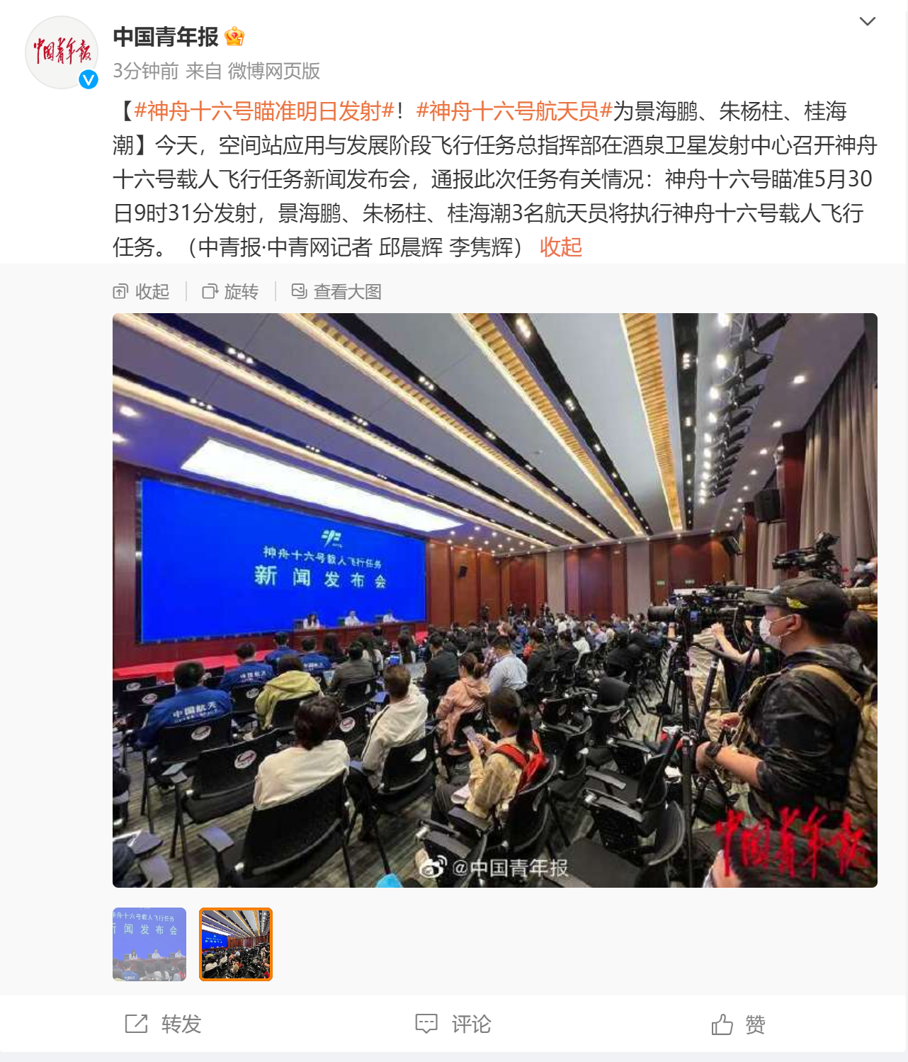 今天上午9时,神舟十六号载人飞行任务新闻发布会在酒泉卫星发射中心召开,通报此次任务有关情况。