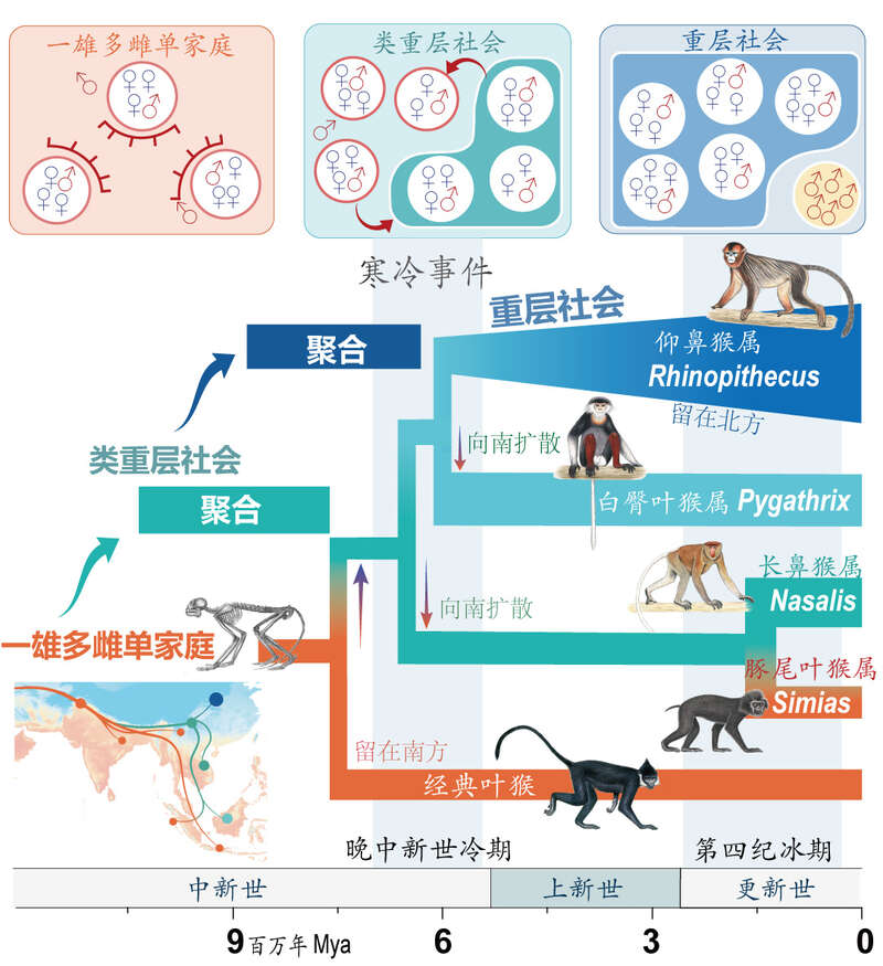 另一支则在晚中新世扩散到了中国云南,形成了奇鼻猴的基部类群。伴随着这一地区晚中新世的寒冷事件,它们的家庭群不再互相排斥,时而分离,时而聚合,形成了类重层社会。