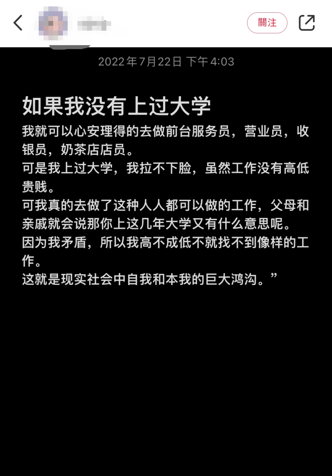 “如果没有上过大学,我就可以心安理得做服务员。”在某社交平台上,这位求职失意大学生简单的一句话引来评论区很多年轻人的共鸣。