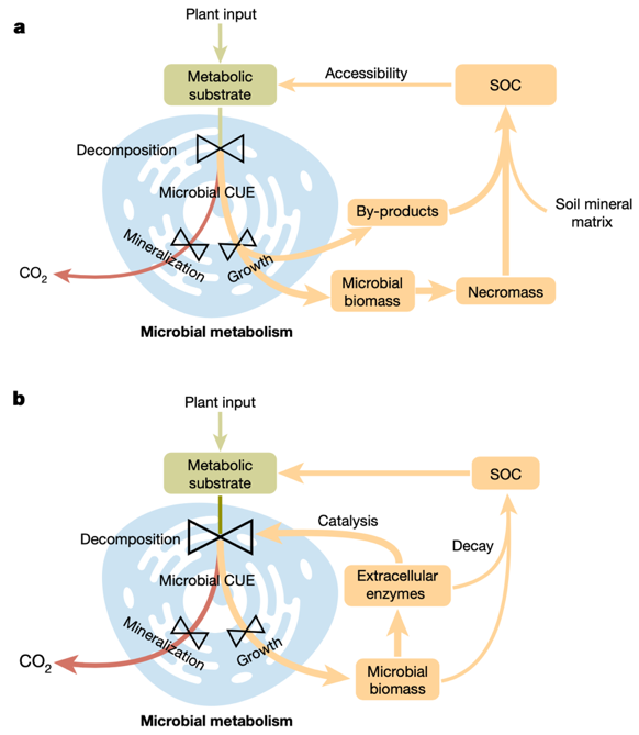 图1.微生物碳利用效率对土壤有机碳的两种控制途径