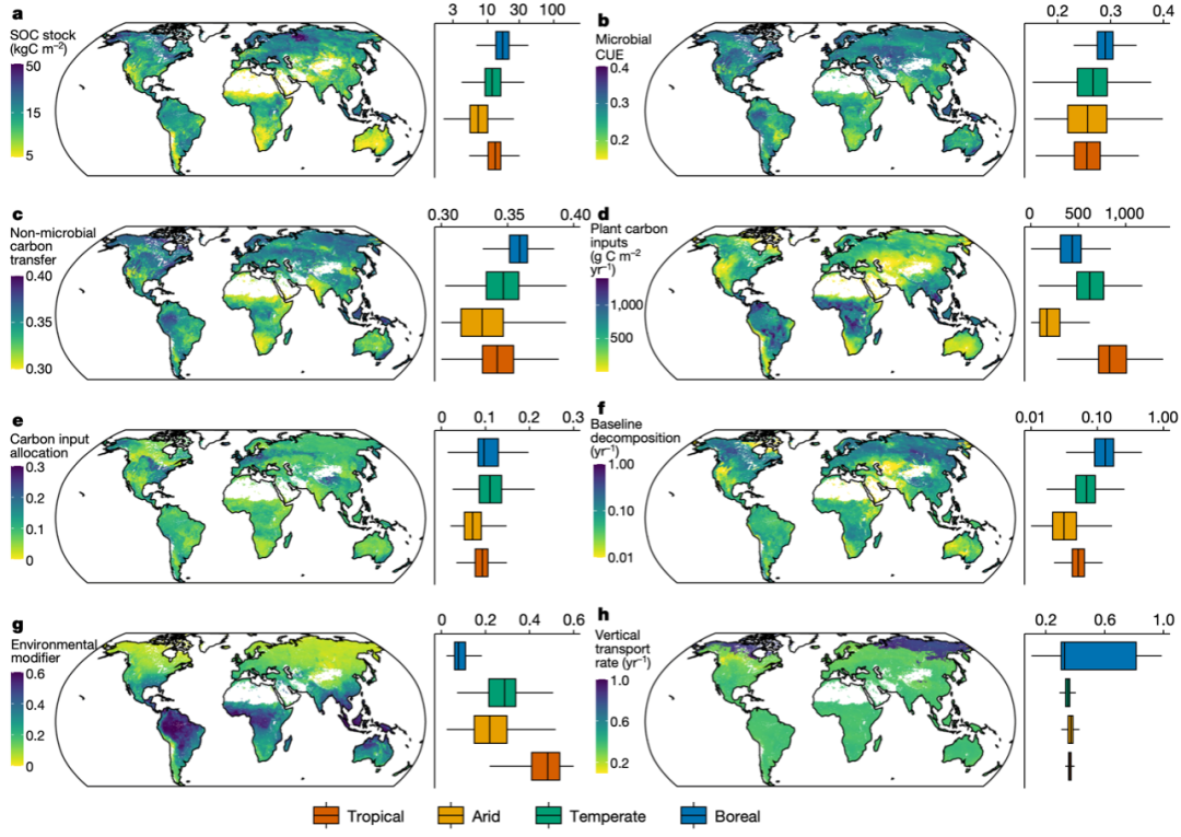 图3. 全球土壤有机碳及其相关过程的空间格局