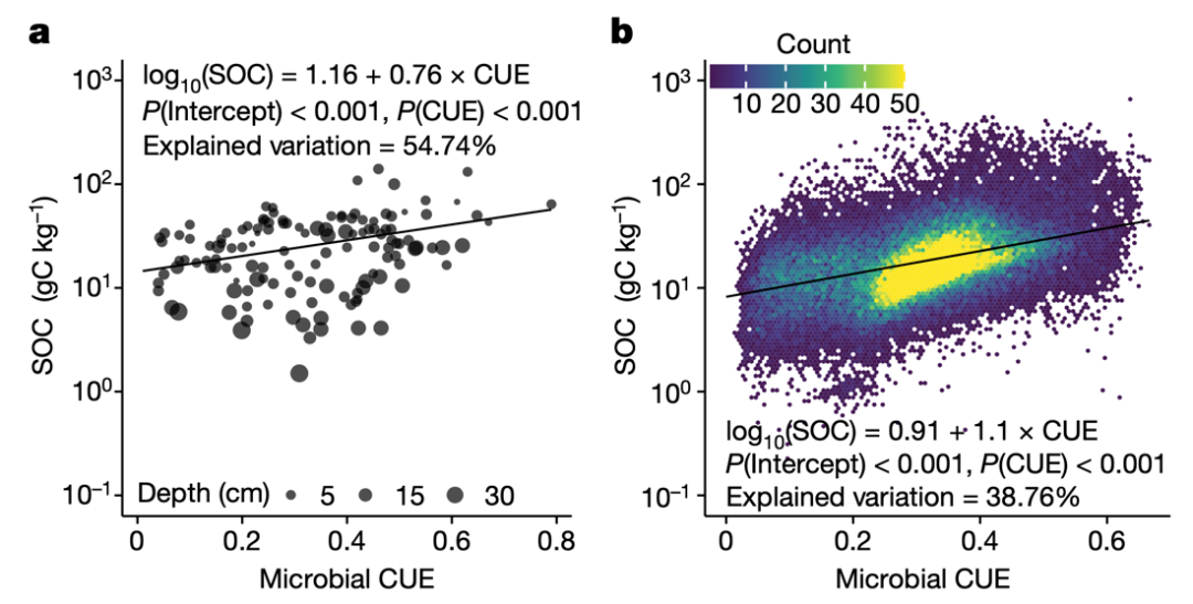 图2. 涌现的微生物碳利用效率与土壤有机碳储量关系