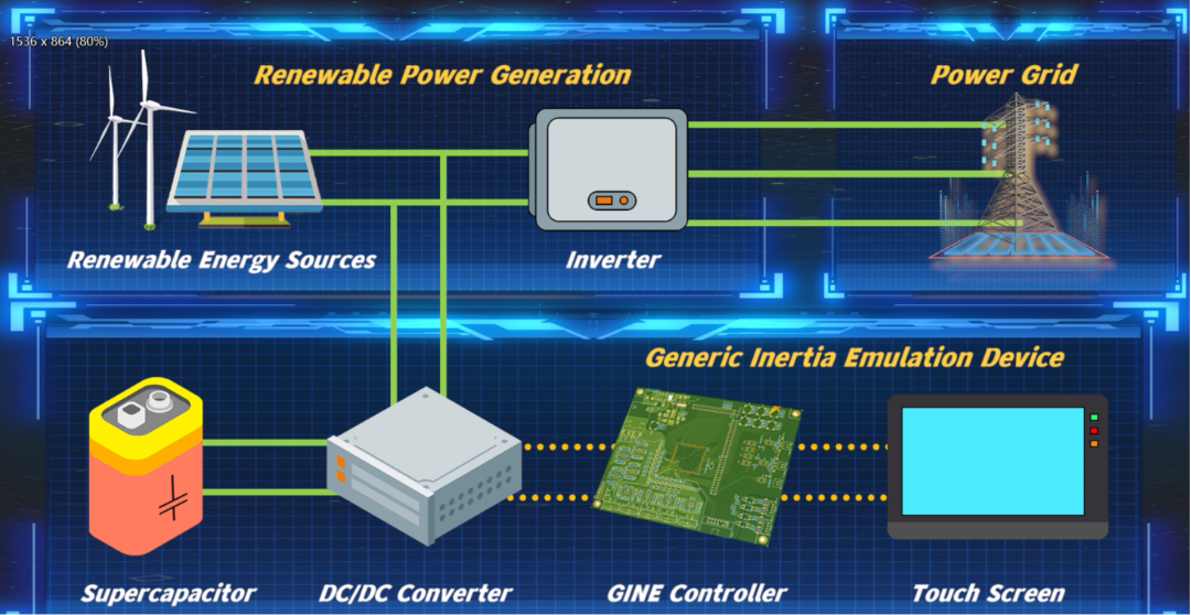 “新能源通用惯量模拟技术与装置”项目针对现代电力系统中风、光等新能源大量并网、取代同步发电机,导致系统频率调节能力下降、断电风险增加的问题,提出了一种新能源通用惯量模拟方案,将快速响应的超级电容器通过全控型DC/DC变换器连接到新能源并网逆变器的直流母线,依据电网频率动态调节超容电压进行有序充放电,来模拟同步发电机的惯量响应。该方案不改变新能源发电的原有电路和控制系统,具有“即插即用”的优势,为提升现代及未来新能源高占比电力系统的频率稳定性提供了一种通用解决方案。