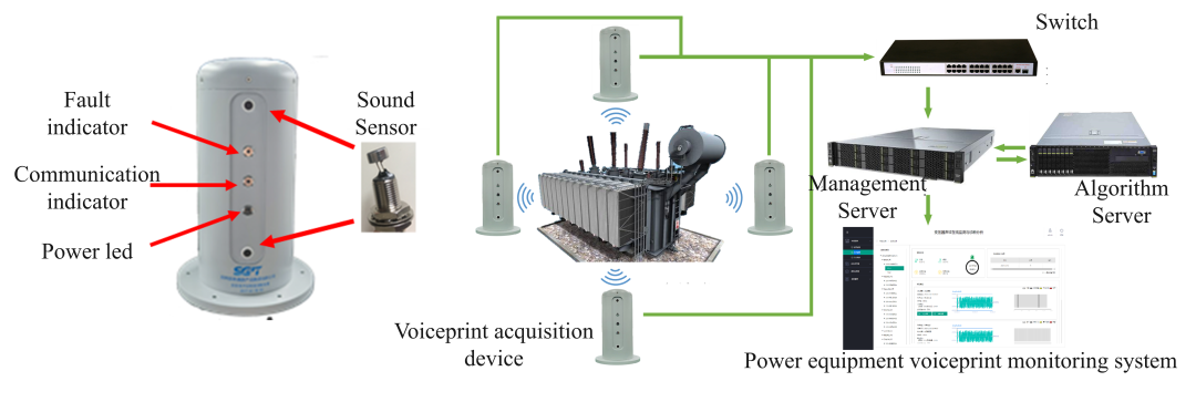 “电力设备声纹监测系统”项目将电力声纹监测与人工智能分析技术进行融合,无需与电力设备产生电磁耦合且能够对设备的整体性机械故障进行检测与诊断,提供了一种无需停电、快捷便利的电力设备监测手段。项目研制了一种基于移动物联网的高精度声纹采集装置,并搭载电力设备声纹在线监测与主动预警平台,通过对电力声学信号进行时频域特征提取,训练直流偏磁、负荷异常、传动卡涩等深度学习算法模型,可实现对电力设备运行状态的实时监测与缺陷早期告警。项目构建了云端集中分析、边缘侧数据处理、端侧智能感知的“云-边-端”协同处理模式,可实现不同地域运行设备监测网络各个环节的互通互联,提升数据自动采集、自动获取、灵活应用能力。