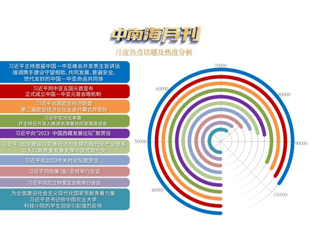 央视网“智闻”系统提取分析5月全网时政新闻热点显示,“习近平主持首届中国—中亚峰会并发表主旨讲话 强调携手建设守望相助、共同发展、普遍安全、世代友好的中国—中亚命运共同体”“习近平同中亚五国元首宣布正式成立中国—中亚元首会晤机制”“习近平出席欧亚经济联盟第二届欧亚经济论坛全会开幕式并致辞”等元首外交活动备受关注。