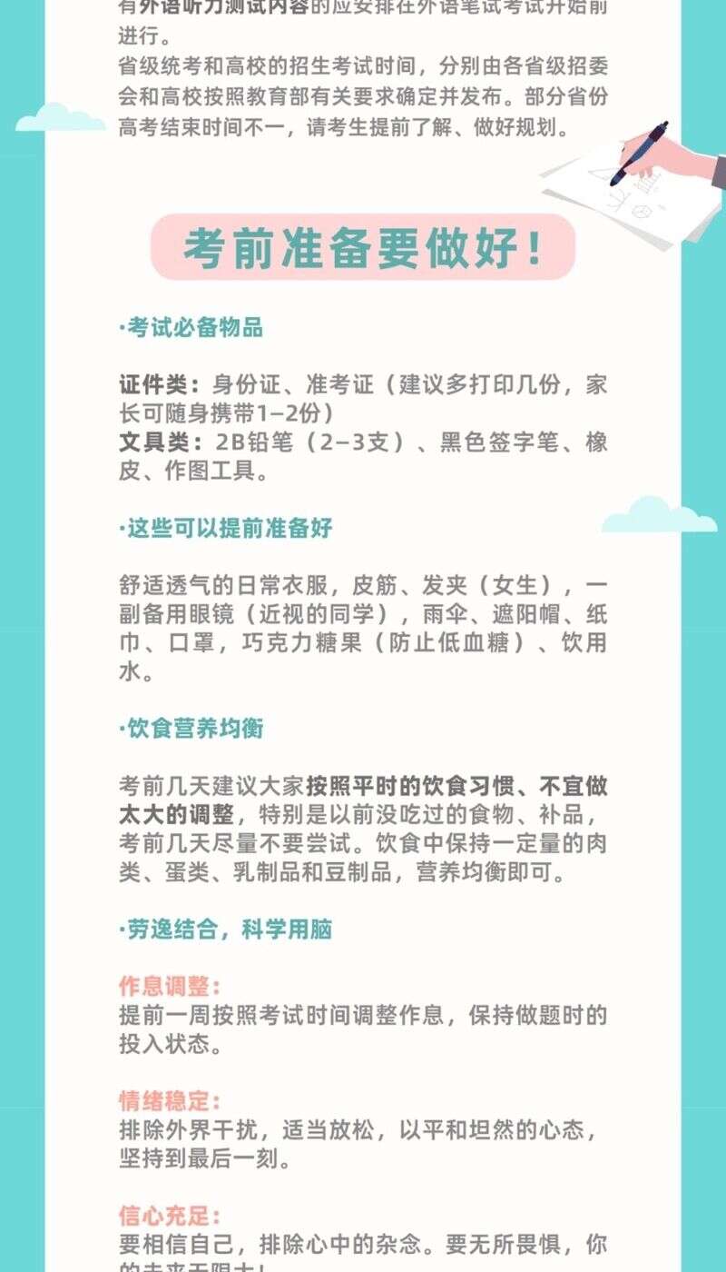 在考前,大家要养足精神,减少熬夜,规律作息,每天可以适当散步、运动,也可以听听音乐、和家人朋友聊聊天等。